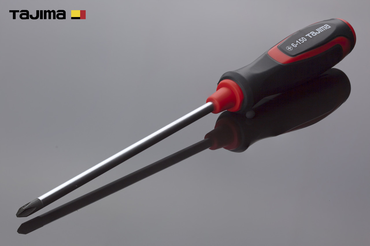 Викрутка хрестоподібна TAJIMA з міцною ручкою з м'якої гуми виготовлена з високоміцної хром-ванадій-молібденової сталі з повним загартуванням та показниками твердості HRC54~58